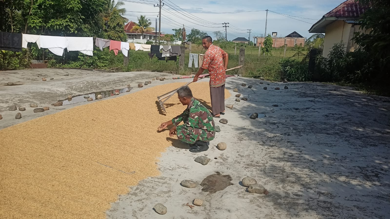 OKEBUNG –  Dalam rangka mengukur keberhasilan hasil panen sekaligus mempererat kedekatan TNI dengan rakyat, Babinsa Koramil 04/Susoh Kodim 0110/Abdya, Serda Abdul Kadir, turun langsung membantu petani binaannya melakukan penjemuran padi di Desa Pinang Kepala Bandar, Kecamatan Susoh, Jumat (24/4/2026).