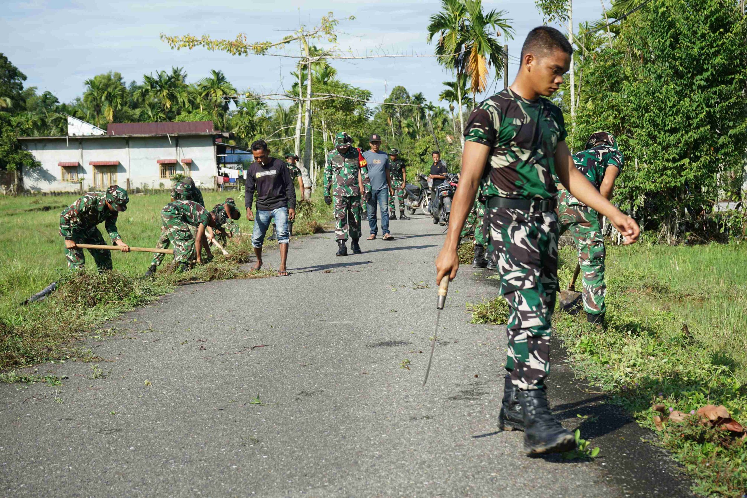 OKEBUNG – Memanfaatkan momentum hari libur aktivitas pada Jumat, Satuan Tugas (Satgas) TNI Manunggal Membangun Desa (TMMD) ke-128 Kodim 0110/Abdya menggelar gotong royong membersihkan bahu jalan serta lokasi kenduri tradisi desa “syukuran bungong kayee” di Desa Gunung Cut, Kecamatan Tangan-Tangan, Jumat (24/4/2026).