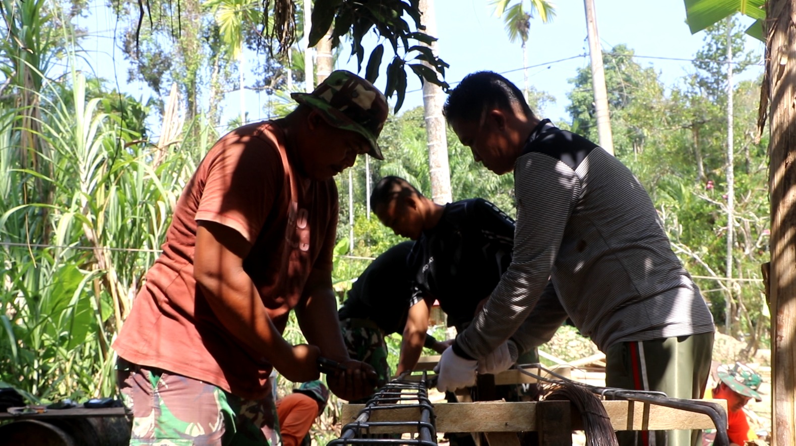 Pekerjaan pembesian ini merupakan tahapan penting dalam proses pembangunan, karena berperan dalam menentukan kekuatan dan ketahanan struktur bangunan. Meski dilakukan secara manual, semangat gotong royong antara personel TNI dan masyarakat tetap terlihat kuat di lokasi.