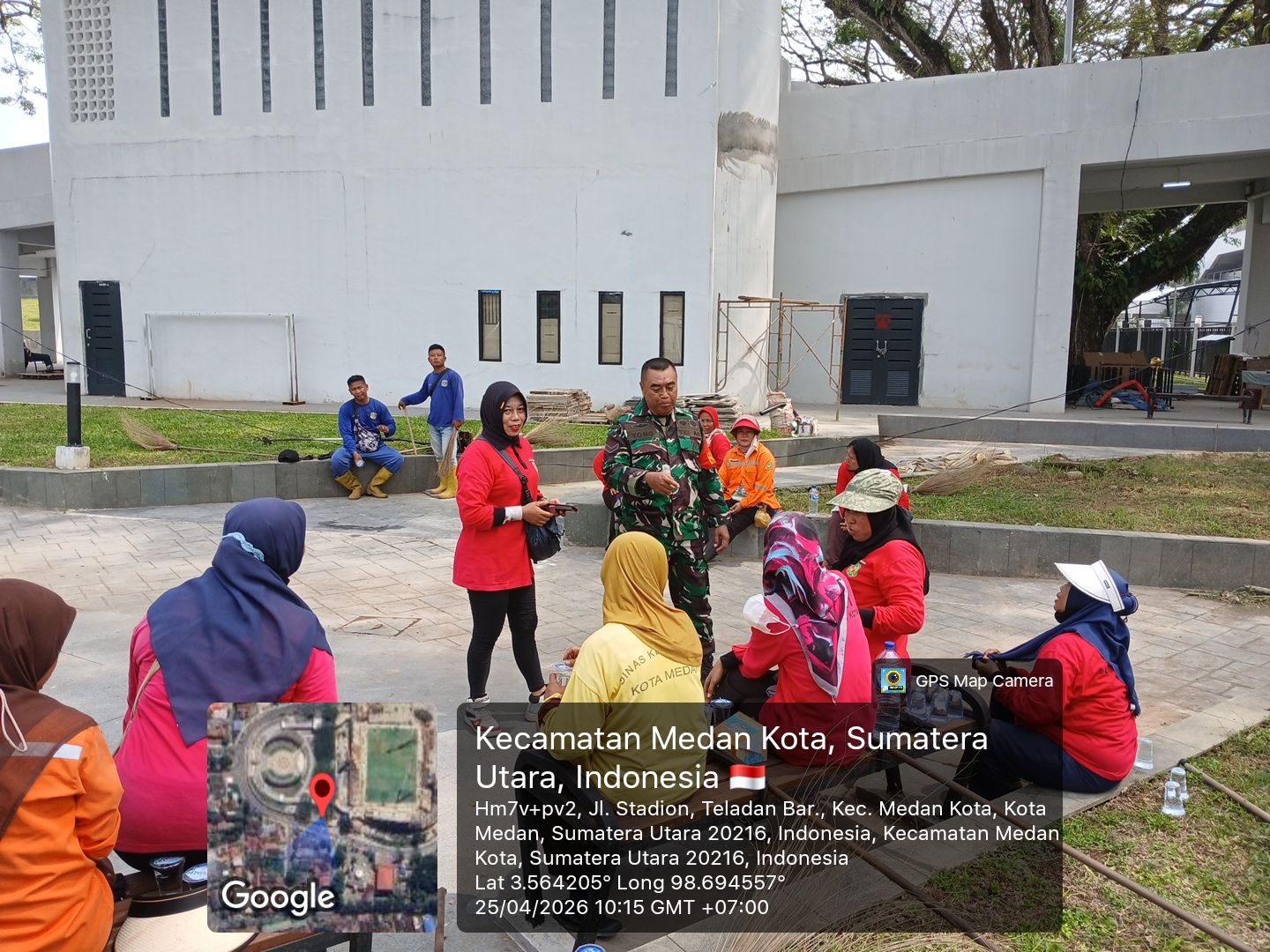 Dalam menciptakan sinegritas dan kerja sama menciptakan keamanan, kebersihan lingkungan, Babinsa Kelurahan Teladan Barat melaksanakan komunikasi sosial dengan petugas kebersihan Taman Teladan.