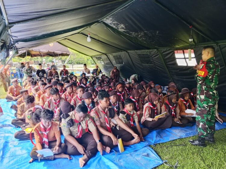 OKEBUNG – Satuan Tugas (Satgas) TNI Manunggal Membangun Desa (TMMD) ke-128 Kodim 0110/Abdya memberikan pembekalan dan penyuluhan tentang wawasan kebangsaan kepada puluhan pelajar pramuka di Desa Gunung Cut, Kecamatan Tangan-Tangan, Kabupaten Aceh Barat Daya (Abdya), Sabtu (25/4/2026).