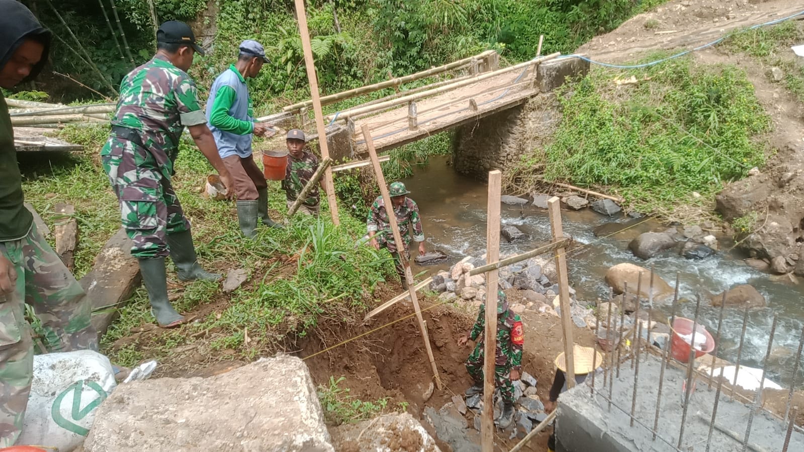 Di lapangan, warga dan anggota TNI bekerja bersama menyelesaikan sayap jembatan yang berfungsi sebagai penahan tanah agar konstruksi tetap stabil. Sementara itu, pemasangan besi WF dilakukan secara bertahap untuk memperkuat rangka jembatan sehingga nantinya aman dan kokoh saat digunakan.