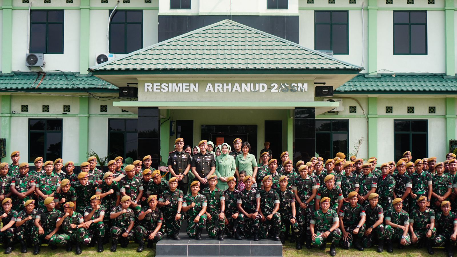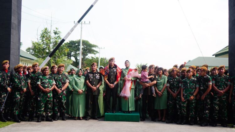 disambut oleh prajurit Resimen 2 dan Yonarhanud 11 dengan membuat lorong sembari menyanyikan lagu selamat datang.