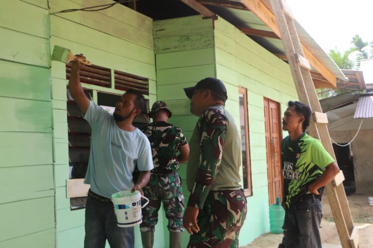 Aceh Timur – Dalam rangka mendukung program TNI Manunggal Membangun Desa (TMMD) Reguler ke-128, personel Satgas TMMD Kodim 0104/Aceh Timur melaksanakan kegiatan pengecatan rumah asuh milik Bapak Solehan, Minggu (26/04/2026).