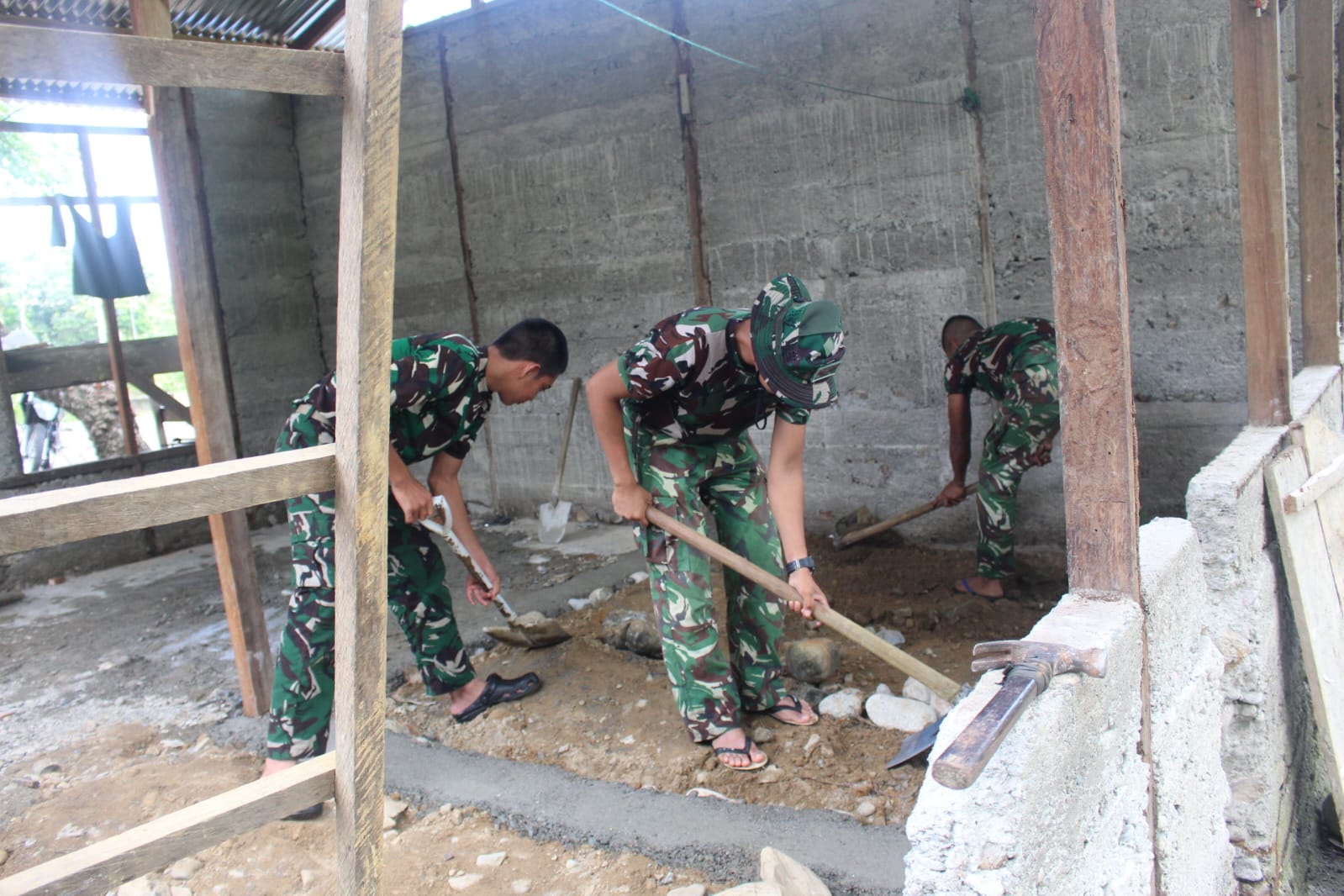 Kebersamaan antara personel TNI dan warga terlihat dalam setiap tahapan pembangunan, mulai dari pengerjaan pondasi hingga struktur dasar bangunan.