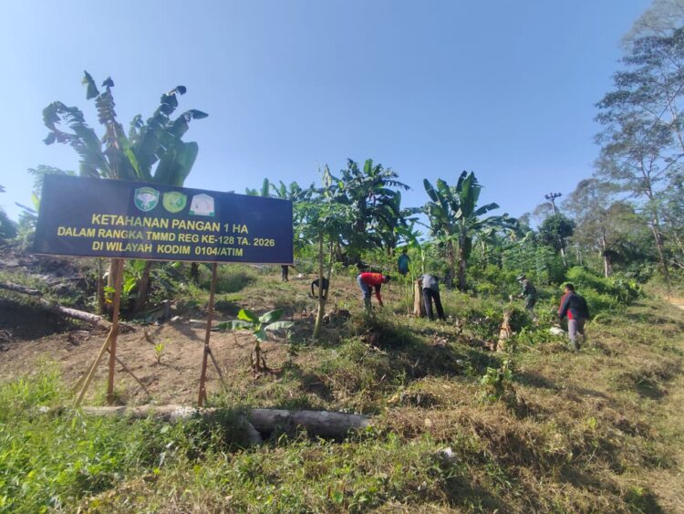 Aceh Timur – Personel Satgas TNI Manunggal Membangun Desa (TMMD) Reguler ke-128 Kodim 0104/Aceh Timur terus melanjutkan pengerjaan sektor ketahanan pangan di Desa Alue Canang, Kecamatan Birem Bayeun, Kabupaten Aceh Timur, Senin (27/04/2026). Lahan tidur yang sebelumnya terbengkalai kini mulai diolah dan dipersiapkan menjadi kebun hortikultura produktif.