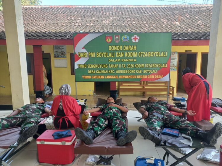 Boyolali – Semangat kepedulian dan kebersamaan kembali ditunjukkan Kodim 0724/Boyolali melalui kegiatan non fisik dalam program TMMD Sengkuyung. Bersinergi dengan PMI Kabupaten Boyolali, digelar bakti sosial donor darah yang berlangsung di Balai Desa Kauman, Kecamatan Wonosegoro, Senin (27/04/26). Kegiatan ini menjadi wujud nyata kontribusi TNI dalam membantu sesama sekaligus memperkuat kemanunggalan dengan rakyat.