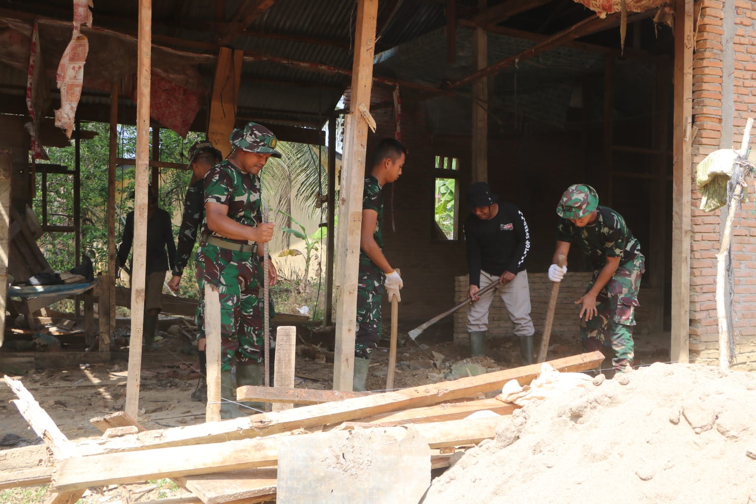 Aceh Timur – Personel Satgas TNI Manunggal Membangun Desa (TMMD) Reguler ke-128 Kodim 0104/Aceh Timur kembali melanjutkan program Rumah Tidak Layak Huni (RTLH). Pada Senin (27/04/2026), pengerjaan sasaran 2 berupa perehaban rumah milik Bapak Abdul Rahman mulai dilaksanakan.