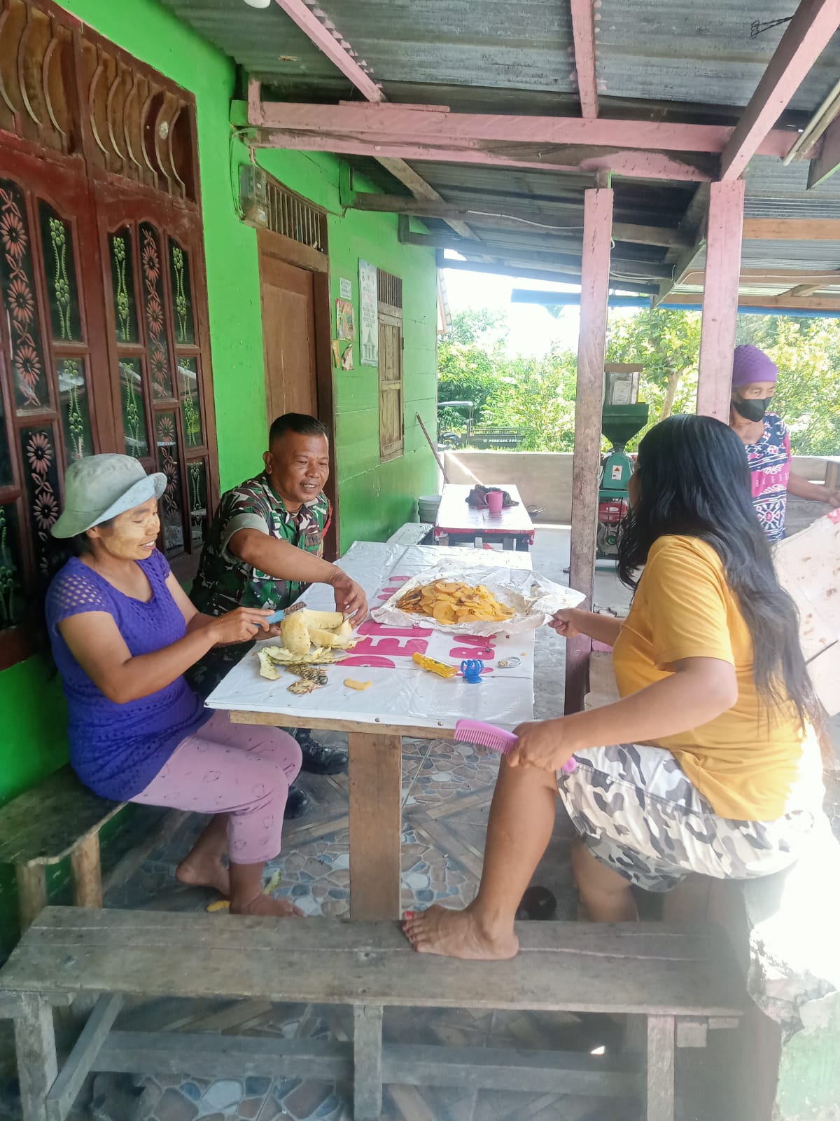 Dalam kunjungan tersebut, Babinsa duduk santai di teras rumah warga sambil berbincang hangat bersama kaum ibu, di antaranya Ibu Nabita Berutu dan Ibu Rini Cibro. Perbincangan berlangsung penuh keakraban, membahas kondisi desa serta perkembangan sektor pertanian yang menjadi sumber penghidupan utama masyarakat setempat.