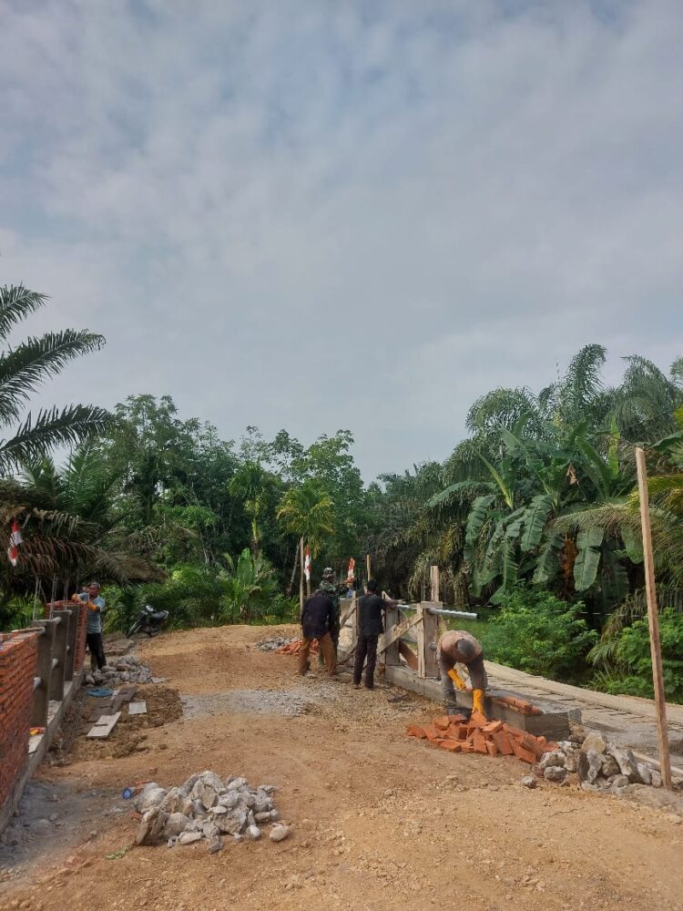 Aceh Timur – Wujud nyata kepedulian terhadap pembangunan di wilayah binaan, Babinsa Koramil 01/Peunaron Kodim 0104/Aceh Timur, Sertu Dani Hamdani, melaksanakan kegiatan gotong royong bersama masyarakat dalam pembangunan Aramco di Dusun Simpang Rambung, Desa Arul Pinang, Kecamatan Peunaron, Kabupaten Aceh Timur, Selasa (28 April 2026)..