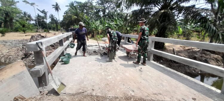 LANGKAT| Di bawah sengatan terik matahari dan guyuran hujan yang tak menentu, semangat personel Satgas TMMD ke-128 Kodim 0203/Lkt dalam membangun jembatan di Desa Pasar Rawa, Kec. Gebang, Kab. Langkat, tetap membara.