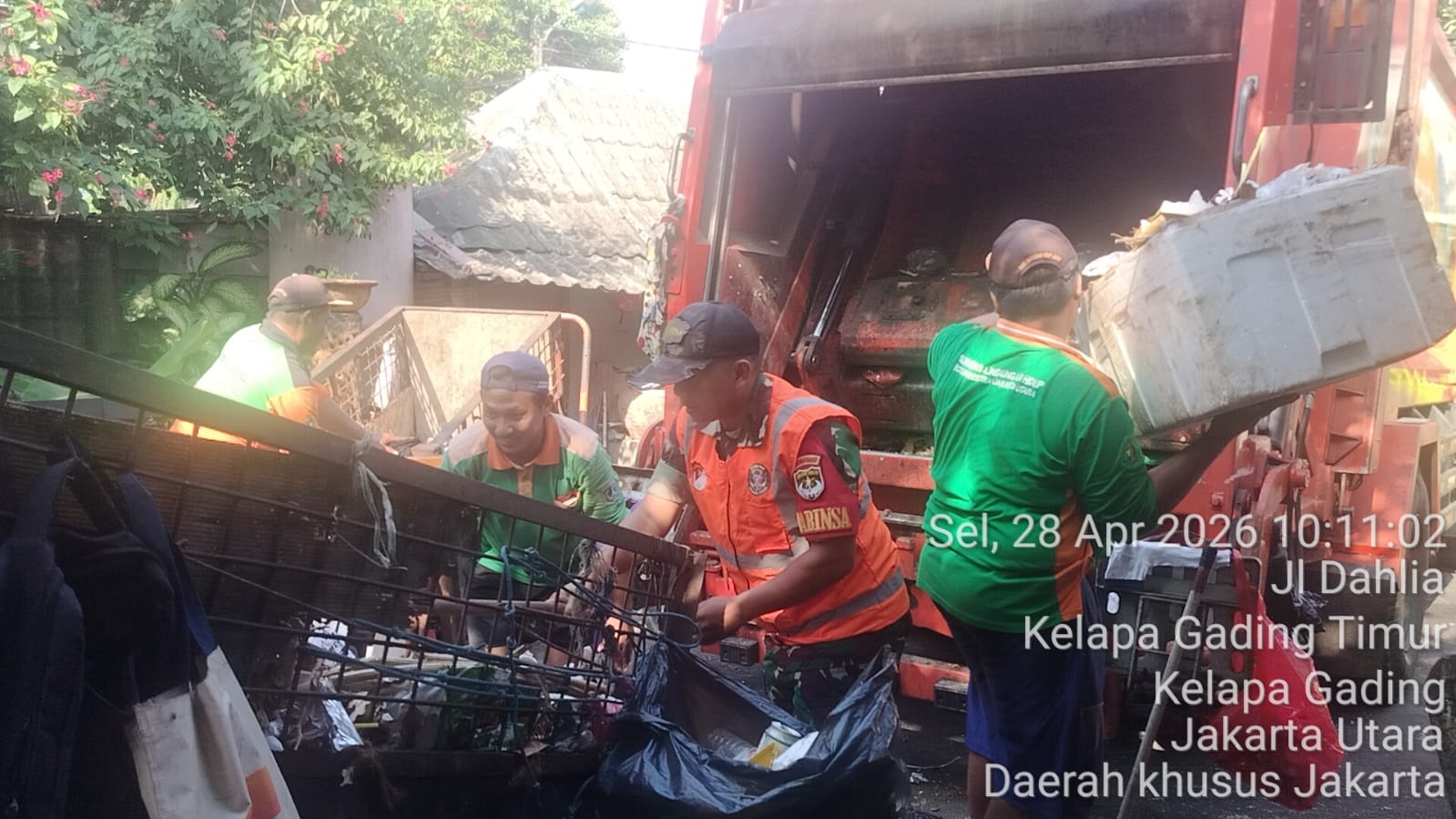 Babinsa Koramil 06/Kelapa Gading bersama komponen pendukung membersihkan sampah di TPSS (tempat penampungan sampah sementara) Jl.Dahlia RT. 004/03 Kel. Kelapa Gading Timur Kec. Kelapa Gading Kota Adm. Jakarta Utara. Selasa 28 April 2026 pukul 10.00 s.d 11.00 Wib.