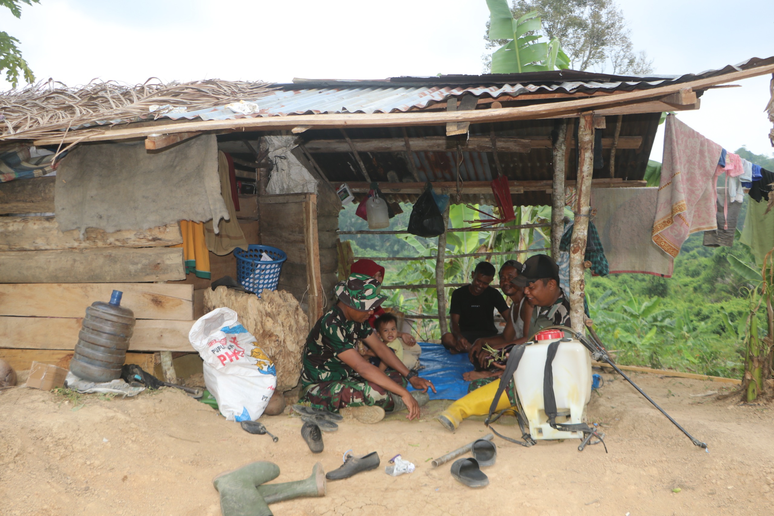 Pertemuan berlangsung sederhana namun penuh kehangatan di gubuk kecil milik Bapak Subur yang berada di tengah areal pertanian. Di tempat itulah, Sertu Amin berbincang santai sambil memberikan motivasi kepada Bapak Subur yang tetap tekun bertani dan bertahan hidup bersama istri serta anak-anaknya di kawasan tersebut.